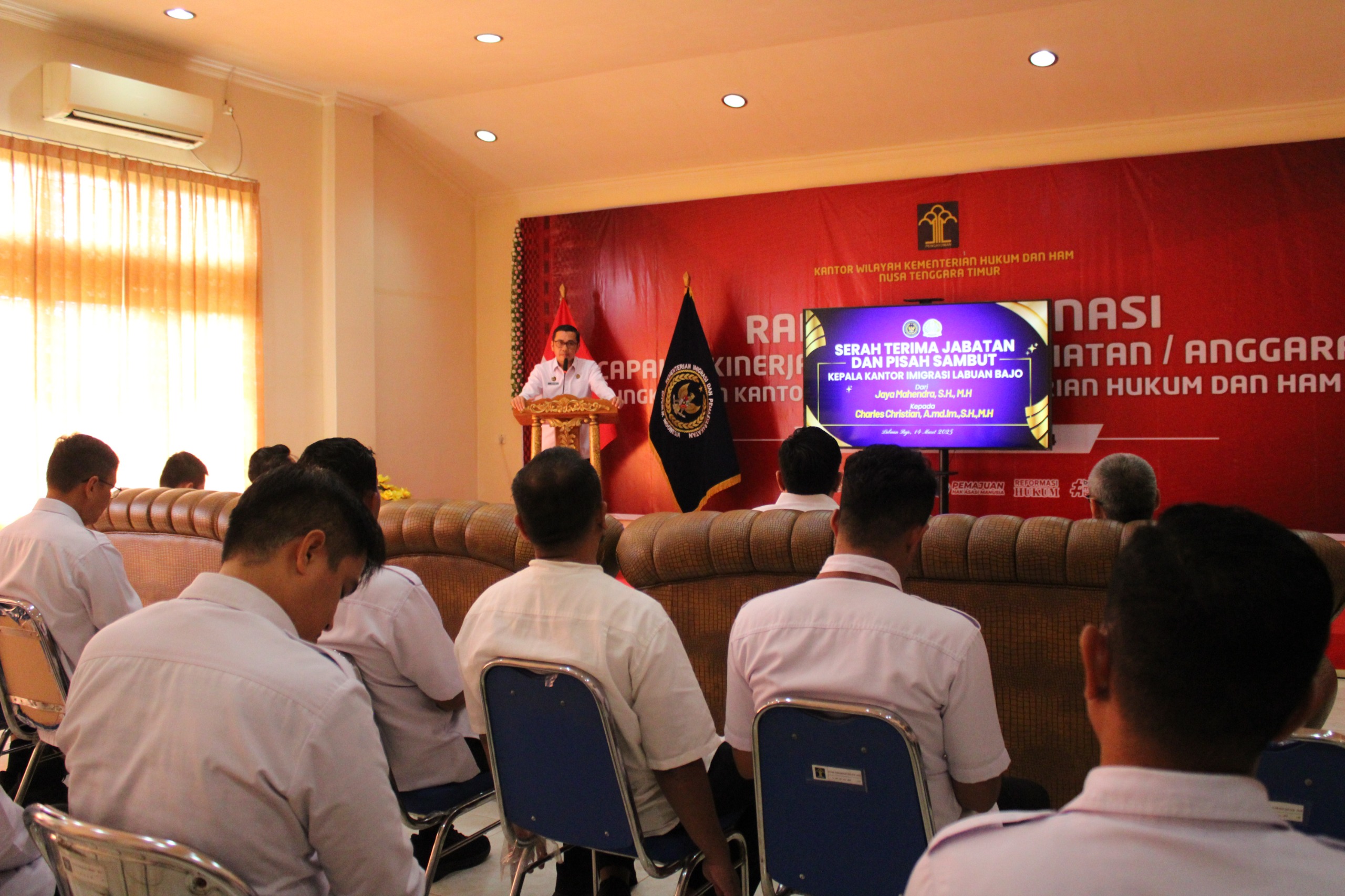 Dalam kegiatan Serah Terima Jabatan Kepala Kantor Imigrasi Labuan Bajo yang dilaksanakan pada hari ini (14/03/2025) di Aula Kantor Imigrasi Labuan Bajo, telah hadir Kepala Kantor Wilayah Direktorat Jenderal Imigrasi NTT, Arvin Gumilang serta para pegawai Kantor Imigrasi Labuan Bajo.